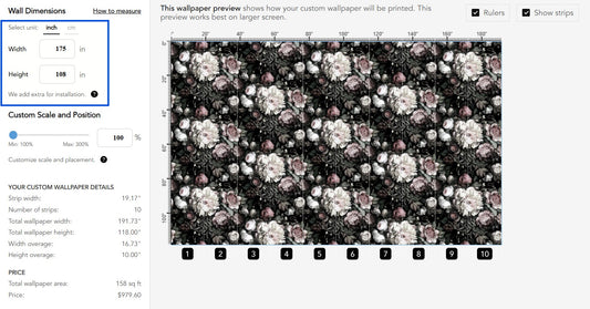 Input your wall’s width and height, and our Wallpaper Configurator will instantly calculate the required wallpaper strips, measurements, and price.