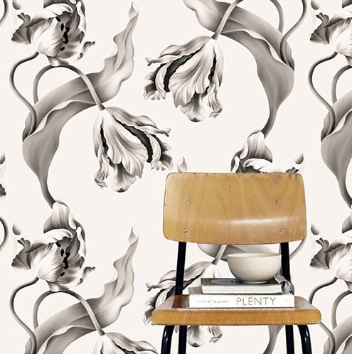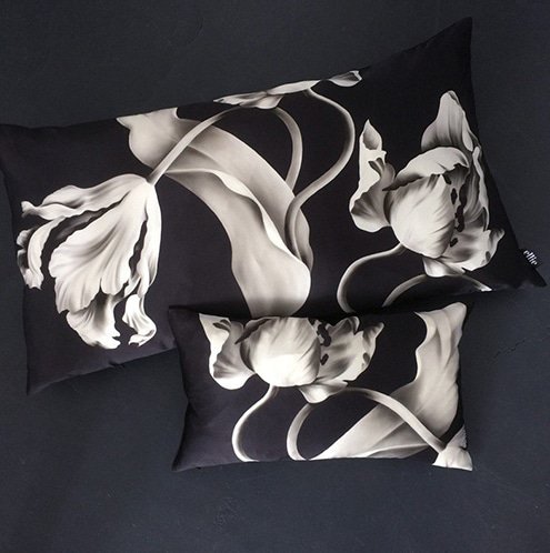 Our heavy cotton fabric, printed with Ellie’s original, dramatic, large-scale ‘Twisting Tulips’ design, is a loosely-woven, coarse fabric that’s suited for furniture upholstery, cushions and table linen.