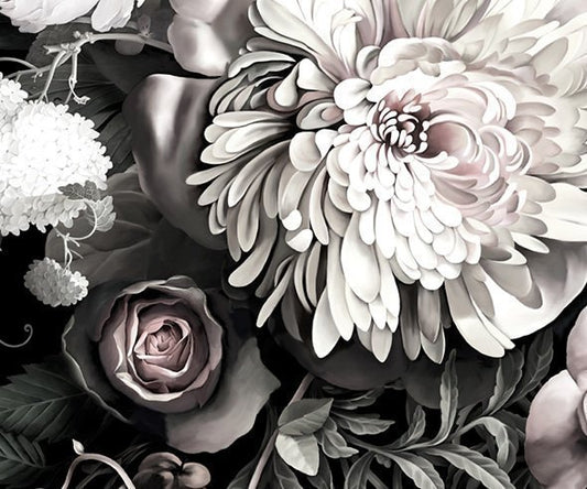 This dramatic, large-scale floral wallpaper is the first sequel to my original ‘Dark Floral’. Just like its predecessor, ‘Dark Floral II Black Desaturated’ is inspired by the still life paintings of the Dutch Golden Age.
