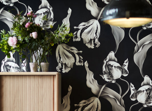 An elegant black and white floral print featuring large tulips that bend and reach in rhythmic movements, ‘Twisting Tulips’ evolved from an original graphite drawing inspired by old-fashioned botanical illustrations.