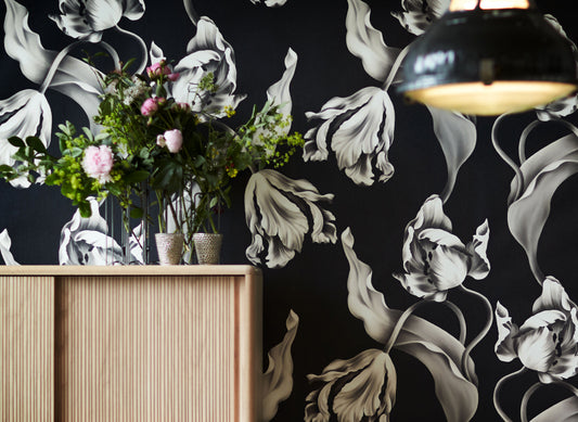 The twisting and bending gestures of the flowers are rhythmic and elegant. This graphic print provides a gorgeous backdrop for a vase of fresh, colorful flowers. I like it with vintage furniture, metal fixtures and more.